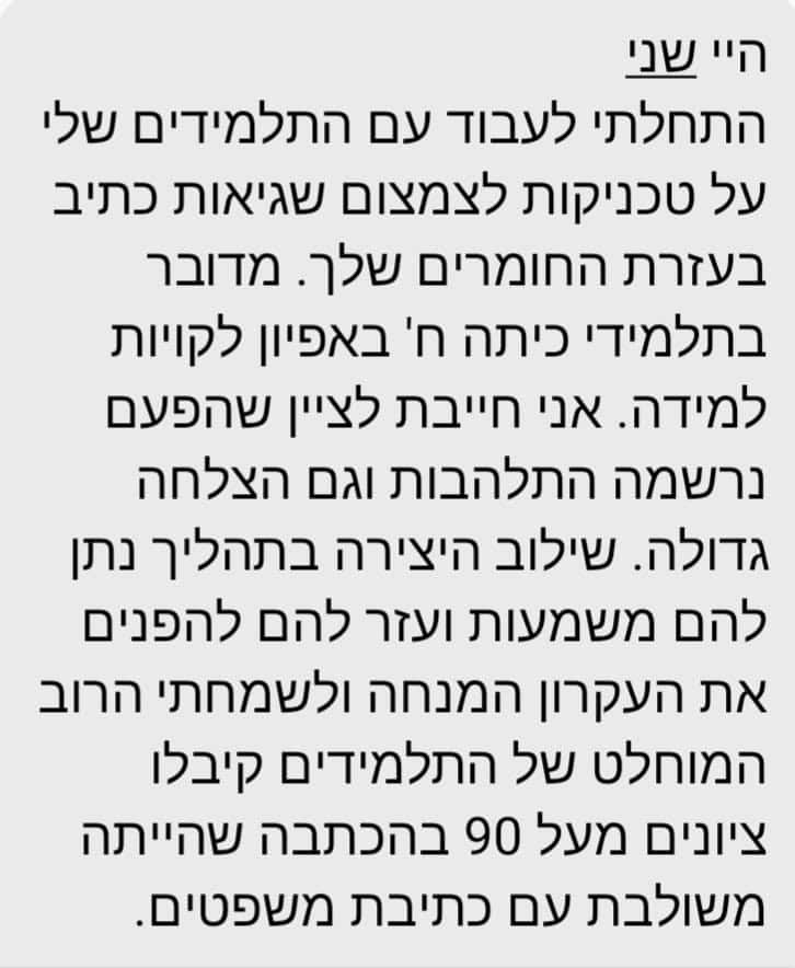 ילדים שלא היו מסוגלים לשבת על כיסא היו לפתע מרוכזים, מלאי מוטיבציה וקשובים. שלוים, נינוחים ומאוזנים. הם התמסרו לצביעה ולמשימות היצירתיות וזה מילא להם מחדש את סוללת הקשב והריכוז שלהם, וכל זה מבלי שהמטרה המוצהרת היא "לחזק את יכולות הקריאה, הבנת הנקרא והכתיבה."
