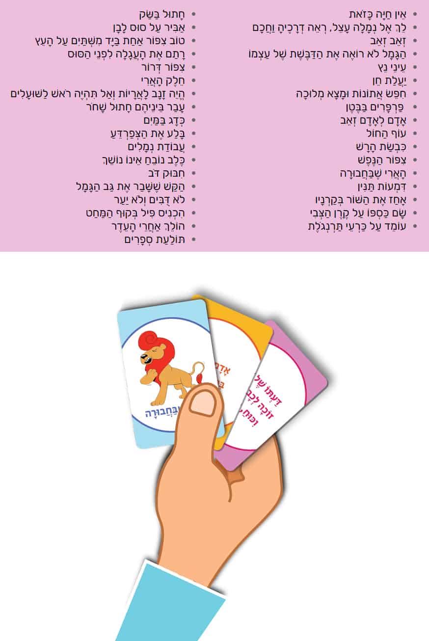 35 קלפי משחק מאוירים עם ביטויים לשוניים מעולם החי.