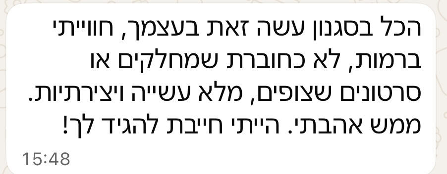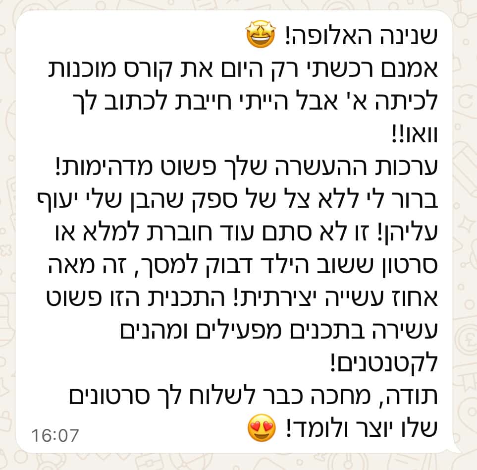 תצאי עם תוכנית מסודרת וברורה – מההתחלה ועד הסוף, בלי התלבטויות ובלי לאלתר. תהיי בטוחה שאת עושה בדיוק את מה שנכון – מדויק, מועיל, ועם תוצאות בשטח. תוכלי להציע להורים מענה מקצועי – והכי כיף? כל ילד חוזר הביתה עם תוצרים מושקעים שהוא עבד עליהם בגאווה ומראה להורים כמה הוא התקדם. ואם עד היום היססת לפתוח קבוצות מוכנות – זה הרגע שלך! את יוצאת עם ביטחון ביכולת שלך להכין כל ילד לכיתה א', באמת.